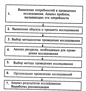 Любое исследование осуществляется в несколько этапов, последовательность которых можно выразить схемой, представленной на рис. 3.1. Рассмотрим эти этапы. На первом этапе необходимо выявить потребности в исследовании, проанализировать проблемы, стоящие перед конкретной системой управления, выбрать из них главную, определяющую важность и первостепенность проведения исследования. Для этого проблема должна быть четко сформулирована. Под проблемой понимается несоответствие фактического состояния управляемого объекта (например, производства продукции) желаемому или заданному (запланированному). Именно в связи с отклонением от плановых (или нормативных) состояний, которое отмечается в определенный момент времени или прогнозируется на будущее, и возникают чаще всего проблемы в организациях. Но их источником может быть и изменение самих целей или нормативов. Например, если в результате анализа информации о продажах изделия руководство предприятия принимает решение о снятии его с производства и переключении на другой вид продукции, это может радикально изменить целевые установки всех подразделений, связанных с данными видами продукции. Менеджеры должны заново составить планы, найти и перераспределить ресурсы, организовать обучение персонала и т.д.
