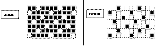 Раппорт не менее пяти. Если на поверхности преобладают нити основы, то это атлас, если утка, то это сатин. Лицевая сторона ткани гладкая и блестящая, изнаночная – матовая. Ткани обладают высокой сыпучестью, стойкостью к трению и скольжением.