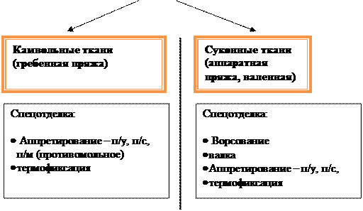 Отделка х/б тканей: · Предварительная отделка состоит: опаливание, отваривание, отбеливание, расшлихтовка, мерсеризация. · Крашение ткани – придание ткани одного цвета. · Печатание рисунка на ткань – нанесение многоцветия при помощи печатного станка. · Специальная отделка – это придание ткани определенного внешнего вида и свойства: Ø Аппрет – создание в ткани определенных свойств в зависимости от назначения: противоусадочный (п/у), противосминаемый (п/с), водоупорный, противогнилостный (п/г), огнезащитный Ø Ворсование – создание на ткани ворса, который сообщает тканям теплозащитные свойства, но ткань становится менее прочной и усадочной Ø Стойкое тиснение – создание на ткани рельефной структуры Ø Металлизация – напыление тонкого слоя металла Ø Флоке – напыление ворсинок в электростатическом поле · Заключительная отделка: Ø Ширение – придание ткани равномерной ширины Ø Каландрирование – утюжка.