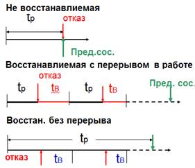 В ГОСТ 15467-79 введено еще одно понятие, отражающее состояние объекта - дефект. Дефектом называется каждое отдельное несоответствие объекта установленным нормам или требованиям. Дефект отражает состояние отличное от отказа. В соответствии с определением отказа, как события, заключающегося в нарушении работоспособности, предполагается, что до появления отказа объект был работоспособен. Отказ может быть следствием развития неустраненных повреждений или наличия дефектов: царапин; потертости изоляции; небольших деформаций. В теории надежности, как правило, предполагается внезапный отказ, который характеризуется скачкообразным изменением значений одного или нескольких параметров объекта. На практике приходится анализировать и другие отказы, к примеру, ресурсный отказ, в результате которого объект приобретает предельное состояние, или эксплуатационный отказ, возникающий по причине, связанной с нарушением установленных правил или условий эксплуатации. При расчетах и анализе надежности широко используются термины "элемент" и "система". Под элементом понимается часть сложного объекта, которая имеет самостоятельную характеристику надежности, используемую при расчетах и выполняющую определенную частную функцию в интересах сложного объекта, который по отношению к элементу представляет собой систему. Например, жёсткий диск (HD) в компьютере выполняет роль элемента, а компьютер - это система. В зависимости от уровня решаемой задачи и степени объединения анализируемых аппаратов и устройств определенный объект может в одном случае быть системой, а в другом - элементом. Так при анализе надежности компьютера его можно "разложить" на множество элементов: блок питания, материнская плата, процессор, память, жёсткий диск и т.д. С другой стороны, для локальной вычислительной сети (ЛВС) компьютер удобнее представить как элемент, у которого есть свои характеристики надежности, нормативно-техническая документация, требования к эксплуатации. Типы систем: 1) Простая – имеет два состояния: рабочее и отказ. 2) Сложная – имеет множество состояний: работа, отказ, восстановление, профилактика. 3) Не восстанавливаемая – не подлежит восстановлению после отказа. 4) Восстанавливаемаяя – возможно восстановление после отказа. 5) Не избыточная – при отказе одного элемента – отказ системы. 6) Избыточная – при отказе некоторого количества элементов - система работоспособна.