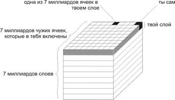 5.3. Что нам делать? Нам следует начать задумываться о том, что пора прийти в равновесие с силой природы, что от этого зависит наше доброе будущее. Нам нужно сфокусировать свои мысли на одной общей системе, объединяющей всех людей, и выработать соответствующее отношение к ближнему. Альтруистически относиться к ближнему — означает сосредоточить наши намерения, помыслы и заботы на его благе. Устремляясь в мыслях навстречу ближнему, человек желает всем остальным людям получить все, что им необходимо. Однако, помимо заботы о насущных нуждах ближнего, нам нужно сконцентрировать силу своей мысли на повышении уровня его осознания. Пусть каждый почувствует, что он часть всех остальных, часть целого, и начнет вести себя соответствующим образом. Работа эта, прежде всего, внутренняя, мыслительная. Очень важно проникнуться данной идеей, не допуская, чтобы она выветривалась из головы, как это, конечно же, будет происходить. Необходимо придавать значимость подобным мыслям, ведь от них зависит наше счастье и благополучие, с их помощью мы избавимся от всех проблем. Хотя поначалу такой настрой кажется несколько нелепым, однако им и только им обусловлено наше доброе будущее. Помимо внутреннего альтруистического отношения к другим, в наших силах также совершать для них реальные альтруистические поступки, а именно: делиться знаниями о цели жизни и о способе ее осуществления. Если мы передаем другим это осознание, если в результате они почувствуют хотя бы общую причастность к проблеме, размышляя и продвигаясь в поисках ее решения, тем самым мы вызываем положительные сдвиги в единой системе, частями которой являемся. В итоге, наше собственное осознание также будет неуклонно повышаться, и мы сразу ощутим позитивные перемены в своей жизни. Один человек, исправляющий свое отношение к ближнему, меняет лик всего человечества. Взаимоотношения между индивидом и человечеством можно охарактеризовать так: ты вместе со всеми находишься в единой системе, однако другие полностью зависят от того, как ты ими управляешь. Весь мир в твоих руках. Так выстроена реальность каждого из людей. Чтобы понять это, вообразим себе куб, состоящий из семи миллиардов слоев — по числу жителей Земли. Каждый слой представляет одного человека и управляется им. В каждом слое имеется семь миллиардов ячеек. Одна из них — это «ты сам», а остальные символизируют других людей, которые в тебя включены. Так выстроена природой единая система. Суть в том, что каждый включает в себя всех, и потому все мы взаимосвязаны друг с другом.