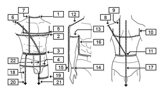 1.Обхват шеи (на уровне воротника рубашки). 2.Обхват груди (По высоким точкам лопаток и груди.) 3.Обхват талии (На уровне талии) 4.Обхват бедер (По высоким точкам ягодиц и живота.) 5.Ширина груди (Расстояние между подмышечными впадинами. Руки должны быть опущены.) 6. Высота плеча косая спереди (Эти две мерки измеряются одним прикладыванием сантиметровой ленты от установочного пояса по центру спинки до высшей точки плеча (8), затем через центр груди и до установочного пояса по центру спереди (6). 8. Высота плеча косая спинки 7.От талии до плеча спереди (Измеряются одним прикладыванием сантиметровой ленты от установочного пояса сзади через лопатку до точки основания шеи(9), затем через высшую точку груди до установочного пояса спереди(7). 9.От талии до плеча сзади 10. Ширина спины (Расстояние между подмышечными впадинами через лопатки. Руки должны быть опущены.) 11. От 7-го позвонка до талии (От 7-го шейного позвонка до установочного пояса.) 12. Ширина плеча (От точки основания шеи до линии среза плеча (желаемая ширина плеча фрака). 13. Обхват плеча (На уровне подмышечных впадин.) 14.Обхват запястья(Эта мерка означает желаемую длину окружности манжет.) 15. Длина рукава (От высшей точки плеча до запястья.) 16. От талии до подмышки (Под руку до подмышечной впадины вплотную вложить плоский предмет (линейку, расческу). Замерить расстояние от края линейки до установочного пояса. 17. Желаемая длина изделия(От установочного пояса сзади до желаемой длины изделия.) 18.Длина брюк сбоку(От установочного пояса до желаемой длины брюк.) 19. Обхват бедра (Сантиметр должен проходить по наиболее выступающей части.) 20.Ширина брюк внизу (Желаемая ширина брюк.) 21. Длина брюк внутри (Длина внутреннего шва брюк.) 22. Глубина шага (От установочного пояса сзади пропустить сантиметровую ленту между ног до установочного пояса спереди.)
