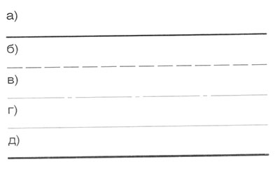 Упражнение 1. Типы линий (см. Ю.Н.Орса, А.Н.Домбровский, Сборник заданий по черчению для слушателей подготовительных курсов МАРХИ чертеж 1).