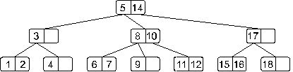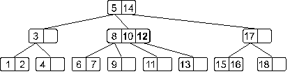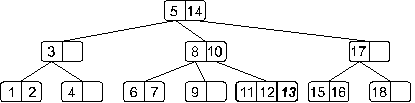 Двигаясь от корня, найдем узел, в который следует добавить искомый элемент. Таким узлом в нашем случае окажется узел, содержащий элементы 11 и 12. Добавим