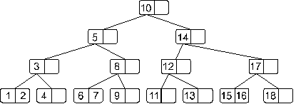 Теперь переходим к родителю, из которого был удален элемент, и проверяем на предмет антипереполнения. Антипереполнение есть и опять, мы должны выбрать два соседних узла (в данном случае: узел, из которого был удален элемент 12 и узел с элементом 17) и произвести слияние двух узлов. При слиянии получается узел с элементами 14 и 17, где 14 позаимствовано у родителя. Естественно, элемент 14 из родителя удаляется.
