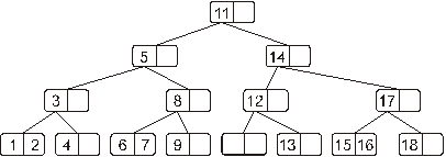 Будем удалять из этого дерева элемент 10. Сначала надо, двигаясь от корня, найти узел дерева, содержащий этот элемент. Он находится в корне. Теперь поскольку элемент находится не в листовом узле, надо заменить его, например, на самый левый элемент правого поддерева. Делаем один шаг вправо и попадаем в корень правого поддерева. Теперь пока не достигнем листового узла, переходим на самого левого сына. Таким образом мы найдем узел, из которого позаимствуем элемент для замены удаленного элемента 10. В найденном узле возьмем самый левый элемент. Таковым оказывается 11. Произведем замену элемента 10 на 11 и удалим элемент 11.