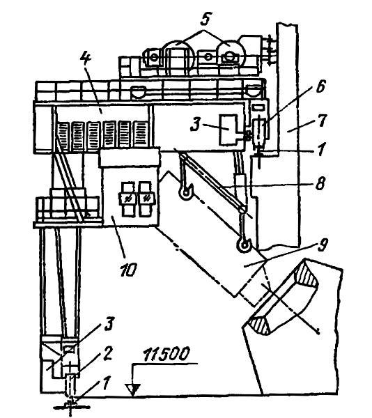 Машина имеет два привода 3 перемещения моста (для верхних и нижних колес). По полупорталу передвигаются две тележки 5, каждая из которых имеет два механизма подъема, обеспечивающих подъем и наклон совков 9 с помощью грузозахватного устройства 8, снабженного четырьмя крюками; для машиниста имеется кабина 10. Выпускаются машины грузоподъемностью 90 и 130 т для конвертеров емкостью 250 и 350—400 т; объем совков составляет 37 и 50 м3 соответственно. Завалочный кран, предназначенный для загрузки лома одним совком, включает мост с механизмом его передвижения вдоль цеха по тем же подкрановым путям, что и заливочные краны, и передвигающуюся по мосту тележку, снабженную двумя механизмами подъема, которые обеспечивают подъем и кантование совка с помощью грузозахватного устройства, имеющего четыре крюка. За рубежом применяют краны, оборудованные двумя перемещающимися по мосту тележками; такими кранами поднимают одновременно два совка.