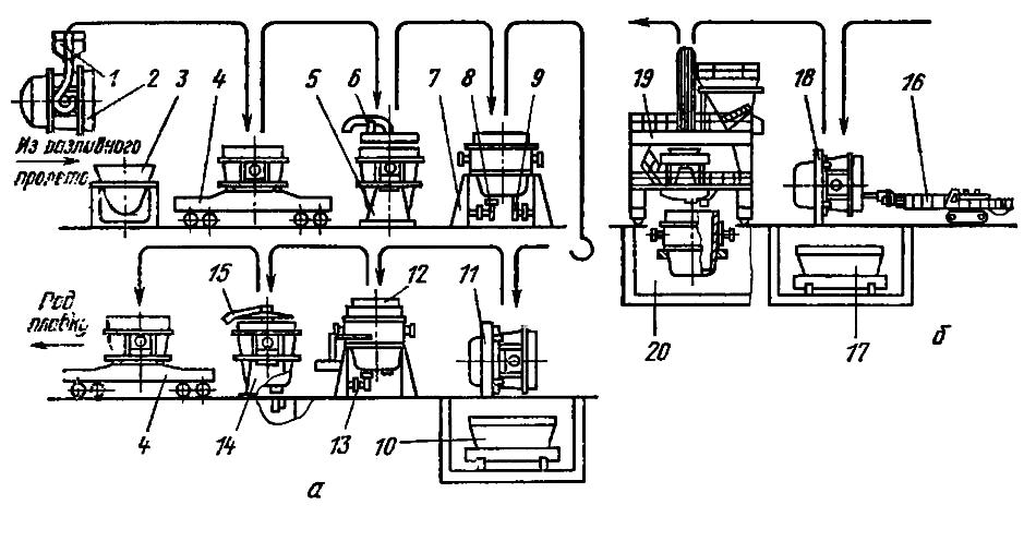 цессе подготовки транспортируют со стенда на стенд мостовым краном. На рисунке 4.4, а показана одна из применяемых схем межплавочной подготовки ковшей. После окончания разливки из ковша 2 с помощью крана 1 сливают шлак в шлаковый ковш (чашу) 3 и затем ковш на сталевозе 4 транспортируют из ОНРС в пролет подготовки ковшей. Ковш краном устанавливают на стенд 5, оборудованный охлаждающим устройством 6; последнее представляет собой опускаемую на ковш крышку с патрубком, по которому подают вентиляторный воздух. После охлаждения футеровки ковш устанавливают на высокий стенд 7, оборудованный манипулятором 8 для снятия и установки шиберных затворов и устройством 9 для выдавливания стаканов. После снятия шиберного затвора и выдавливания стакана ковш устанавливают на поворотный стенд 11, где осматривают футеровку и удаляют скрап и остатки шлака с помощью кислорода в короб 10. Далее ковш возвращают на высокий стенд, где устанавливают новый шиберный затвор и проверяют его работу с помощью устройства 13. В ковш опускают кессон 12, с помощью которого устанавливают стакан и уплотняют гнездо, после чего ковш переносят на стенд 14, оборудованный устройством 15 для сушки и разогрева ковша (опускаемая на ковш крышка с газовой горелкой). Разогретый ковш ставят на сталевоз 4 и транспортируют к конвертеру. Схема работ при ремонте футеровки, включающем замену рабочего слоя, отличается от показанной на рис. 34, а тем, что вместо операций, выполняемых на стенде 11, делают работы, показанные на рис. 4.4, б. Вначале, как и при межплавочной подготовке, сливают шлак, охлаждают ковш, удаляют шиберный затвор и стакан 1—9 (рисунок 4, а). Затем выполняют работы» изображенные на рисунке 4, б: ковш устанавливают на поворотный стенд 18 и удаляют изношенную футеровку с помощью машины 16; бой футеровки попадает в короб 17. Потом ковш устанавливают в яму 20 и выполняют новый набивной слой футеровки с помощью машины 19. Дальнейшие операции—установку стакана и шиберного затвора и разогрев ковша — выполняют так же, как и при межплавочной подготовке 12—15 (рисунок 4,а).