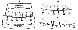Рис. 9. Верньеры На рис. 8, б отсчет В = 3° 06,5'. В теодолитах 2ТЗО, 2ТЗОП цена деления лимба равна 1°, шкала разделена через 5' (рис. 8, в), отсчеты на рисунке В = 3° 18', Г - 164° 43'. Верньер - это отсчетное устройство в виде шкалы, позволяющее достаточно точно оценивать доли деления лимба. Дуга АВ на лимбе (рис. 9, а) разбита на и - 1 делений, а на алидаде дуга такой же длины - на п делений, т.е. на 1 деление больше. Штрихи деления образуют шкалу верньера. Цена одного деления лимба равна ц, поэтому дуга АВ = µ (п - 1), цена одного деления верньера составляет λ, следовательно, АВ = λ п. Если λ п = µ (п - 1) = µ n - µ, то
