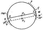 где it — произведение номера совмещенного штриха верньера и его точности. На рис. 9, в показан верньер, у которого µ = 60'; п = 12; t = 60/12 = 5'; i = 10, поэтому отсчет а = 54° 50'. Эксцентриситет алидады. В угломерных геодезических приборах на алидаде могут размещаться два или одно диаметрально противоположных отсчетных устройства I и II (рис. 10). В первом случае отсчетная система называется двусторонней, во втором - односторонней. Ось вращения алидады О 2 должна совпадать с центром кольца делений лимба О 1 При этом условии с помощью двусторонней отсчетной системы получают отсчеты М и N, различающиеся на 180° (в нашем примере М = 7°, N = 187°), т.е. М = N - 180°. Несовпадение оси О2 вращения алидады с центром О 1 делений лимба называется эксцентриситетом алидады. При эксцентриситете получают отсчеты М ' и N ', которые отличаются от отсчетов М и N на величину х, при этом М = М ' — х, N = N' + х. Последнее из этих равенств запишем в виде N — 180° = N + х — 180°. Сложим первое и третье равенства и полученную сумму разделим пополам: (М + N - 180°) / 2 = (М ' + N ' - 180°)/2, следовательно, среднее из отсчетов по двум диаметрально противоположным отсчетным устройствам с учетом их различия на 180° свободно от погрешности за счет эксцентриситета алидады. На рис. 10 М ' = 9°, N ' = 185°, средний отсчет М = 7° свободен от этой погрешности. В теодолитах с односторонней отсчетной системой рассмотренный эксцентриситет должен быть малой величиной, что обеспечивает завод изготовитель. Остаточная погрешность измерения углов за счет эксцентриситета устраняется принятой методикой двойного измерения углов.