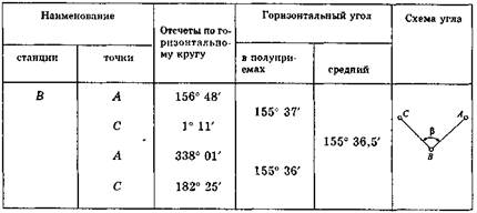 (правила работы с приборами) Установка теодолита и визирных целей. Видимость геодезического пункта обеспечивается визирными целями — визирными цилиндрами пирамид или сигналов, марками на штативах, вехами, стержнями, шпильками, иглами. Продольная ось визирной цели должна быть отвесна. Это условие проверяется по вертикальному штриху визирной сетки теодолита. Точность центрирования визирной цели над пунктом должна соответствовать точности центрирования теодолита. Перед началом работ визирными целями обозначают стороны угла, а над его вершиной устанавливают теодолит. Его центрируют над вершиной измеряемого угла по нитяному отвесу с погрешностью около 5 мм, а по оптическому отвесу или зрительной трубой, направленной объективом вниз (теодолит ТЗО), — с погрешностью до 1 мм. Сначала центрирование производится приближенно — поочередными осторожными заглублениями ножек штатива в землю с контролем по нитяному отвесу, затем окончательно — передвижениями отгоризонтированного теодолита по головке штатива. Теодолит горизонтируют с помощью цилиндрического уровня: уровень устанавливают параллельно двум подъемным винтам (см. рис. 12, а), которыми приводят пузырек в нуль-пункт. Затем теодолит поворачивают на 90° (см. рис. 12, б) и третьим винтом подставки приводят пузырек уровня в нуль-пункт. В горизонтированном теодолите при любом направлении уровня его пузырек не должен отклоняться от нуль-пункта на более чем половину деления ампулы. Зрительную трубу фокусируют: вращением окуляра получают четкое изображение визирной сетки, а вращением фокусировочного винта трубы — четкое изображение предмета. Устраняют параллакс (см. § 4.1). Рассмотрим два способа измерения горизонтальных углов — способ отдельного угла и способ измерения нескольких горизонтальных углов с общей вершиной. Последовательность действий при измерениях составляет программу работ на станции. Способ измерения отдельного угла. Горизонтальный угол ABC (схема к табл. 2) можно рассматривать как правый по ходу А—В—С. Таблица 2 Журнал измерения горизонтальных углов теодолитом ТЗО