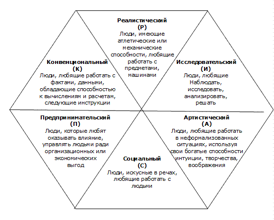 Практика показывает, что возможно наиболее важное решение, которое принимает человек в жизни, - это выбор карьеры. Американский социолог Джон Л. Голланд исследовал теорию выбора карьеры. Он считал, что этот выбор есть выражение личности, а не случайное событие, где играет роль шанс. По его мнению достижение в том или ином виде карьеры зависит от соответствия между его личностью обстановкой работы. Д.Л.Голланд считает, что каждый человек в определённой степени относится к одному из шести типов личности. Один из типов всегда доминирует, однако человек приспосабливаясь к условиям обстановки, использует широкий спектр стратегий в рамках двух или более типов. В своих работах Д. Голланд использовал шестиугольник для представления близости и дистанции между различными типами личности, который представлен на рис.13 Д.Голланд утверждает, что чем ближе ориентации в шестиугольнике, тем ближе типы личности. Используя этот подход, можно сделать вывод, что если доминирующая и вторая ориентация близки, то карьеру выбрать относительно легко. С дугой стороны не сходность первичной и вторичной ориентации приводят к трудностям выбора. Таким образом, самооценка своих способностей, навыков и деловых черт предполагает знание себя, своих сил, слабостей и недостатков. Только при этом условии можно правильно поставить цели карьеры. Цели карьеры проявляются в причине, по которой человек хотел бы иметь конкретную работу, занимать определённую ступень на иерархической лестнице должностей.