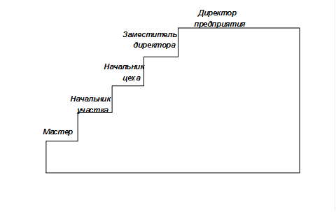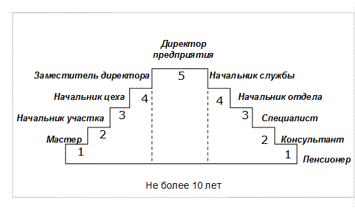 Жизненный путь работников состоит из длительного подъема по служебной лестнице с постепенным ростом его потенциала, знаний, опыта и квалификации. Соответственно меняются занимаемые должности на более сложные и лучше оплачиваемые. На определённом этапе работник занимает высшую для него должность и старается удержаться в ней в течение длительного времени. А потом «прыжок с трамплина» ввиду ухода на пенсию. В силу ряда причин: личных интересов, невысокой загрузки, хорошего трудового коллектива, приобретённой квалификации- работников вполне устраивает занимаемая должность и они готовы оставаться в ней до ухода на пенсию. Таким образом, карьера «Трамплин» может быть вполне приемлемой в условиях рыночной экономики для большой группы специалистов и служащих. Модель карьеры «Лестница». Модель карьеры «Лестница» предусматривает, что каждая ступень предусматривает собой определённую должность, которую работник занимает фиксированное время (не более 5 лет). Она представлена на рис.15. Такого срока достаточно для того, чтобы войти в новую должность и проработать с полной отдачей. С ростом квалификации, творческого потенциала и производственного опыта руководитель или специалист поднимается по служебной лестнице. Каждую новую должность работника занимает после повышения квалификации.