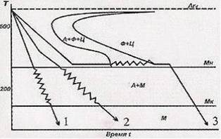 6. Целью отпуска является … устранение закалочных напряжений, повышение вязкости и пластичности 7. Способность стали к увеличению твердости при закалке называется … закаливаемостью 8. При термической обработке легированных сталей по показанному на рисунке режиму 3 распад аустенита происходит с образованием … бейнита