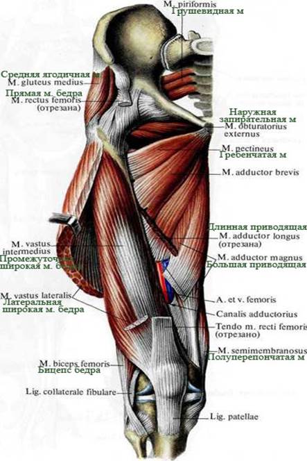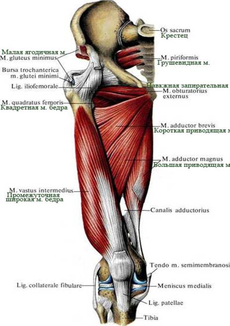 6. Грушевидная мышца, m. piriformis (см. рис. 398-402, 408, 409, 412), имеет вид плоского равнобедренного треугольника, основание которого берет начало от передней поверхности крестца, латеральнее отверстий между II и IV крестцовыми тазовыми отверстиями. Конвергируя, мышечные пучки направляются кнаружи, выходят из полости малого таза через большое седалищное отверстие, foramen ischiadicum majus, и, переходя в узкое и короткое сухожилие, прикрепляются к вершине большого вертела. У места прикрепления мышцы имеется сумка грушевидной мышцы, bursa m. piriformis. Проходя через большое седалищное отверстие, мышца полностью его не заполняет, оставляя по верхнему и нижнему краям небольшие щели, через которые проходят сосуды и нервы. Функция: супинирует бедро, а также участвует в его отведении. Иннервация: rr. musculares plexus sacralis [SI - SII(SIII)]. Кровоснабжение: аа. gluteae superior et inferior.