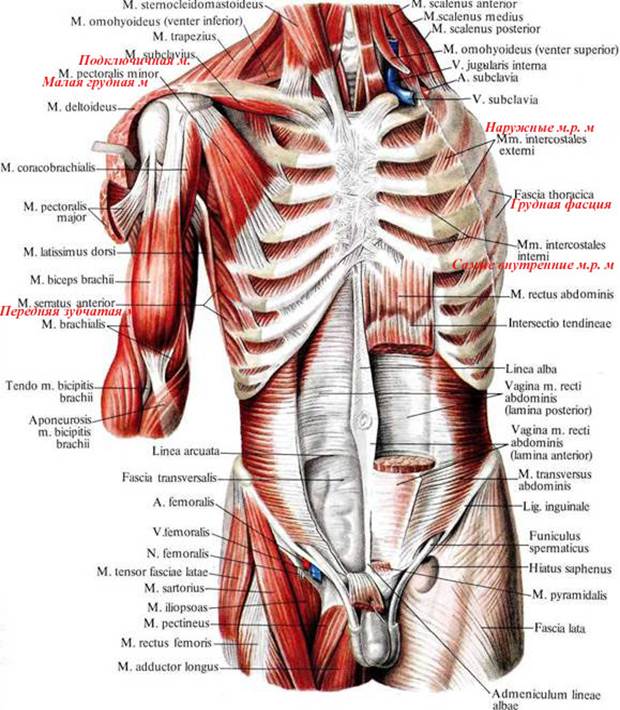 310. Мышцы туловища; вид спереди. (Справа удалены большая грудная мышца, наружная и внутренняя косые и прямая мышцы живота; слева - поверхностные мышцы груди, наружная и внутренняя косые мышцы живота и частично прямая мышца живота.)