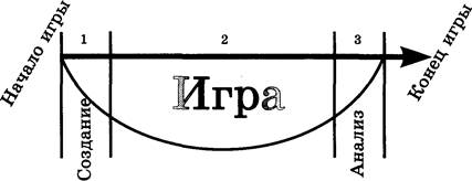 Первое, с чего начинается игра, — это заключение соглашения. Как должна проходить игра? Какими будут правила? Игрок является тем, кто создает эти характеристики. Он тот, кого рассматривают как причину или источник. У каждой игры есть начало и конец. Приведенный ниже рисунок должен приблизительно показать, сколько времени отводится каждому этапу игры. Для начала мы создаем реальность. Далее, по окончании процесса создания реальности, наступает вторая фаза игры. Здесь, собственно, и происходит игра. В конце игры проводится анализ, чтобы использовать ее опыт в новой игре.