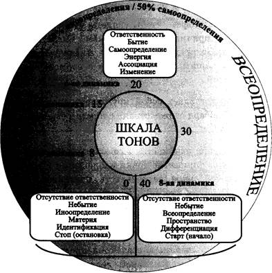 Шкала тонов Не надо быть философом, чтобы увидеть, что жизнь движется между крайностями — причиной и следствием. Следствиями являются смерть, лишения, драматические моменты в жизни[81]. Причина, как правило, соответствует нашим представлениям о нормальном, благоприятном развитии событий. Вся жизнь представляет собой круговорот “рождение — рост — смерть”, который Хаббард отождествлял с циклом действия (начало, изменение, остановка). Этот цикл действия начинается в статике (небытие), проходит через сотворение бытия (принятие точки наблюдения и создание предпосылок для игры) к действию (деятельность, познание) и заканчивается завершением (подведением итогов) действий (см. также раздел “Двенадцатая динамика”). Взглянем на то, как проходит развитие человека. В детские и школьные годы создаются предпосылки или основы для будущей игры (профессиональной деятельности). Далее человек вступает в стадию профессионального роста. В определенный момент наступает высшая точка в карьере, которая у большинства людей приходится на середину их жизни. В пенсионном возрасте игру покидают. Конечно, у разных людей по-разному. Некоторые после окончания своей профессиональной жизни находят новую игру. Таким образом, они вступают вновь в цикл “начало, изменение, остановка”. Нетрудно заметить, что переходу к окончанию игры или к смерти предшествует ослабление усилий по непрерывному сотворению нового. Для моментальной, или хронометрической классификации позиции игрока в игре от состояния причины до положения следствия Хаббард разработал так называемую Шкалу тонов [82].