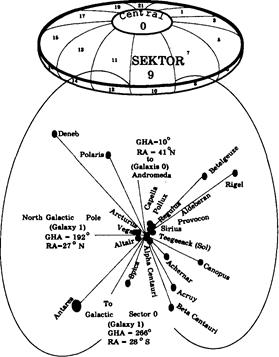 В данном разделе будет представлена история сектора 9 — той части нашей Галактики, в которой расположена Земля. Данная информация в основном является результатом исследований, проведенных Биллом Робертсоном. Вначале несколько слов о нем самом. Уильям Робертсон (02.12.1936 — 12.05.1991) являлся одним из самых высокопоставленных сотрудников Морской организации. Многие годы он занимал должность капитана флагманского корабля “Аполло”. Хаббард присвоил ему титул капитана, награду, которую кроме него получила только жена Хаббарда Мери Сью. С этого момента Робертсон становится известен как "капитан Билл". После того как в 1981 году Хаббард исчез и не имел больше связей с организацией, Билл занялся выяснением причин тяжелого положения, в котором оказалась саентологическая церковь. Его теория заключалась в том, что она захвачена изнутри и передана агентам американского правительства. В процессе расследования он постепенно нашел большое количество информации, которая подтвердила его подозрения. Он описал свои открытия в так называемых "Сводках событий в секторе". При этом он использовал неопубликованные работы Хаббарда о политической ситуации в Галактике и о существовании инопланетной деструктивной группы, действующей на Земле. Ниже приводится информация, которая впервые была опубликована в виде “Сводки событий в секторе”. (выпуск № 19 от 20.02.84) Попробуем представить нашу Галактику в виде огромного плоского диска с небольшим кругом в центре. Подобно торту, она разделена на куски — секторы. Линии раздела расходятся от центрального круга к внешним границам. Круг в центре называется сектором 0, или Центром (см. рисунок). Двенадцать клинообразных секторов (с нечетными номерами) находятся на верхней стороне диска, другие двенадцать секторов (с четными номерами) — на нижней. Данная модель позволяет эффективно патрулировать Галактику и координировать действия по обороне, прикрывая в случае нападения тыл удаленными приграничными секторами. Фактически благодаря такой системе каждый сектор имеет шесть приграничных секторов, включая центральный. Сектор, к которому относятся Земля, Солнечная система, Маркаб и четыре других цивилизации, — это и есть сектор 9.