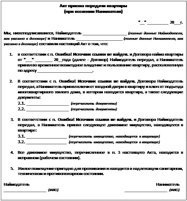 10.1. Настоящий договор не подлежит государственной регистрации и вступает в силу с момента его подписания Сторонами. 10.2. Стороны подтверждают, что они обладают полной гражданской дееспособностью, под опекой и попечительством не находятся, на учете в психоневрологических и наркологических учреждениях не состоят. 10.3. К отношениям Сторон, не урегулированным настоящим договором, применяется действующее законодательство Российской Федерации. 10.4. Настоящий Договор составлен в двух экземплярах, имеющих одинаковую юридическую силу, по одному для каждой из Сторон. 10.5. К настоящему Договору прилагается и является неотъемлемой его частью: 10.5.1. Приложение № 1 – «Форма акта приема - передачи квартиры (при вселении Нанимателя)». 10.5.2. Приложение № 2 – «Форма акта приема - передачи квартиры (при выселении Нанимателя)». 10.5.3. Приложение № 3 - «Форма расписки о получении оплаты от Нанимателя». 10.5.4. Приложение № 4 - «Форма расписки о получении залога от Нанимателя». 10.5.5. Приложение № 5 - «Форма расписки о получении залога от Наймодателя». Приложение 1 "Форма акта приема - передачи квартиры (при вселении Нанимателя)" к договору найма квартиры от "___" _________ 20__ года