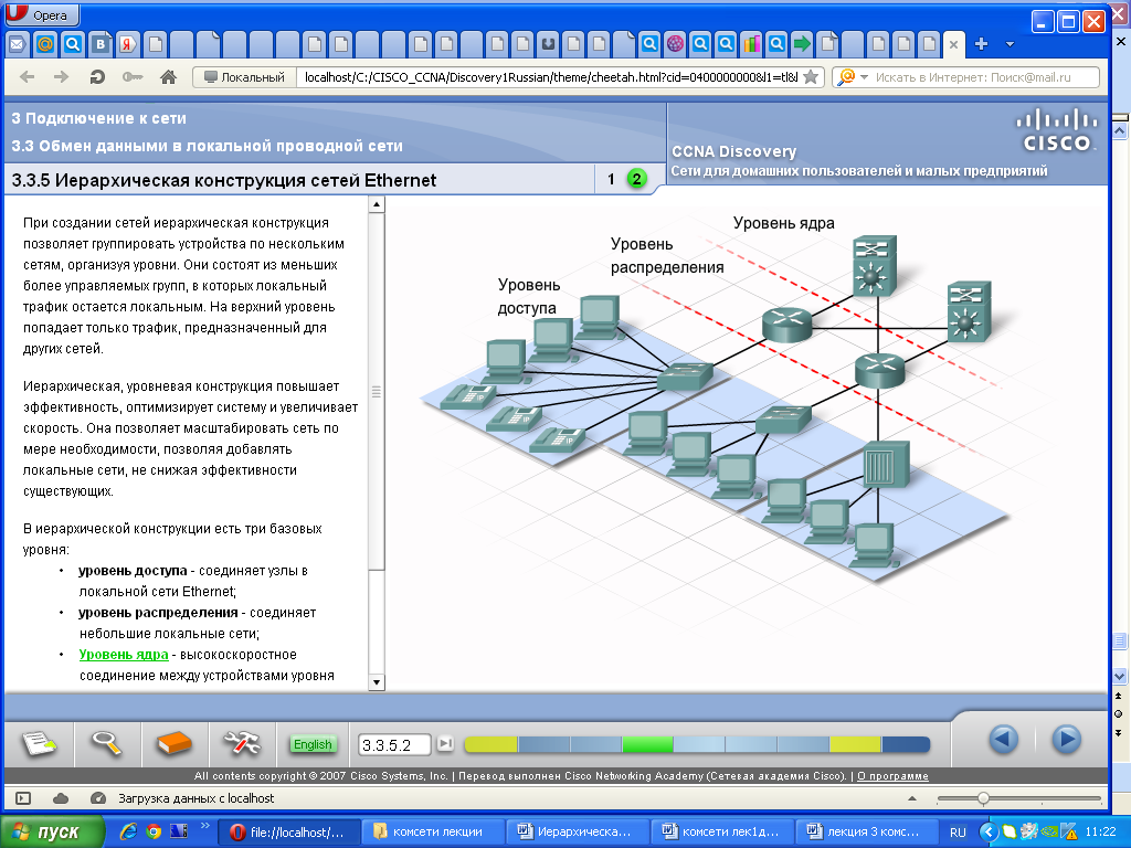 При создании сетей иерархическая конструкция позволяет группировать устройства по нескольким сетям, организуя уровни. Они состоят из меньших более управляемых групп, в которых локальный трафик остается локальным. На верхний уровень попадает только трафик, предназначенный для других сетей. Иерархическая, уровневая конструкция повышает эффективность, оптимизирует систему и увеличивает скорость. Она позволяет масштабировать сеть по мере необходимости, позволяя добавлять локальные сети, не снижая эффективности существующих. В иерархической конструкции есть три базовых уровня: уровень доступа - соединяет узлы в локальной сети Ethernet; уровень распределения - соединяет небольшие локальные сети; Уровень ядра - высокоскоростное соединение между устройствами уровня распределения. В такой иерархической конструкции необходима схема логической адресации, которая позволяет определить положение узла. Такая схема адресации называется Интернет-протоколом (IP).