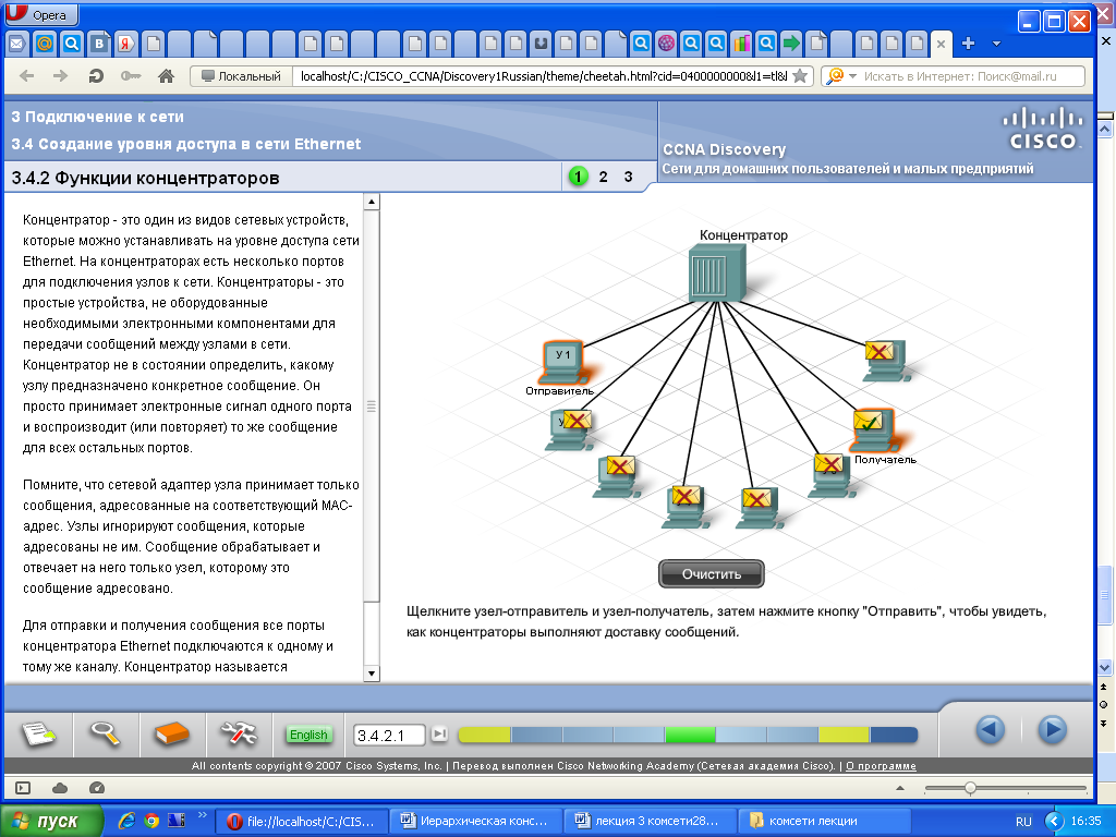 Концентратор - это один из видов сетевых устройств, которые можно устанавливать на уровне доступа сети Ethernet. На концентраторах есть несколько портов для подключения узлов к сети. Концентраторы - это простые устройства, не оборудованные необходимыми электронными компонентами для передачи сообщений между узлами в сети. Концентратор не в состоянии определить, какому узлу предназначено конкретное сообщение. Он просто принимает электронные сигнал одного порта и воспроизводит (или повторяет) то же сообщение для всех остальных портов. Помните, что сетевой адаптер узла принимает только сообщения, адресованные на соответствующий MAC-адрес. Узлы игнорируют сообщения, которые адресованы не им. Сообщение обрабатывает и отвечает на него только узел, которому это сообщение адресовано. Для отправки и получения сообщения все порты концентратора Ethernet подключаются к одному и тому же каналу. Концентратор называется устройством с общей полосой пропускания, поскольку все узлы в нем работают на одной полосе одного канала.