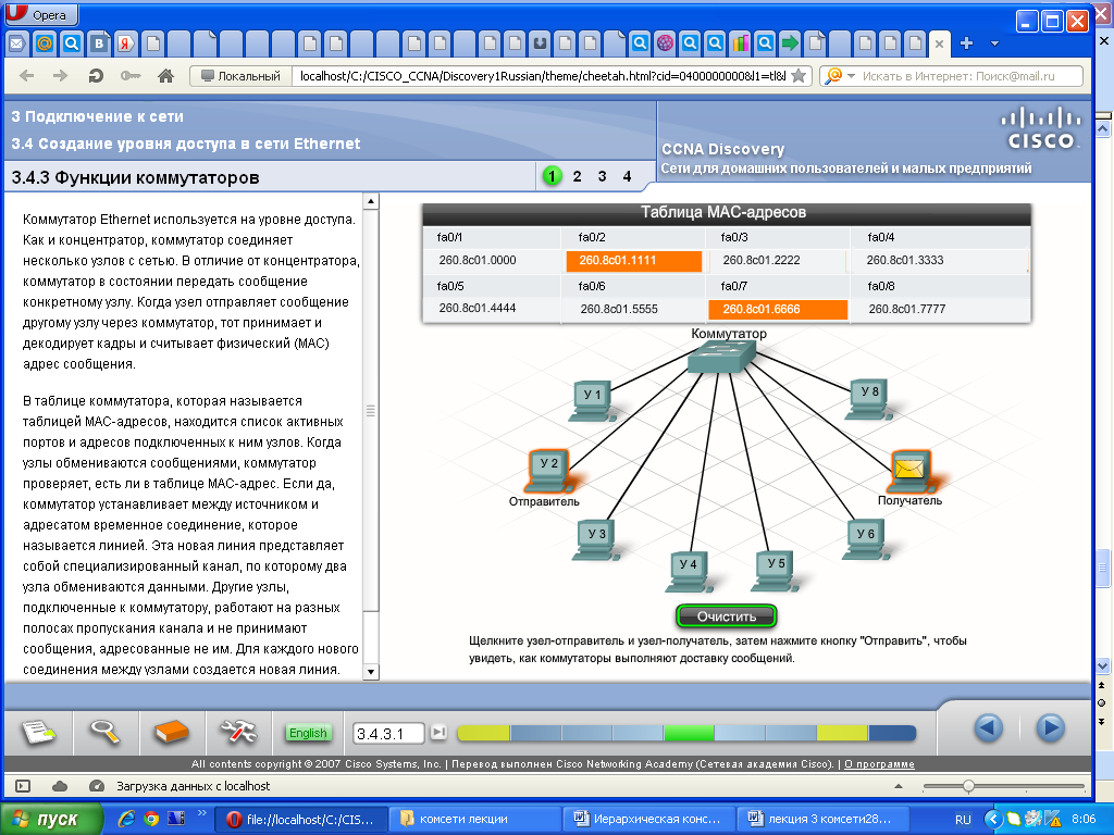 Коммутатор Ethernet используется на уровне доступа. Как и концентратор, коммутатор соединяет несколько узлов с сетью. В отличие от концентратора, коммутатор в состоянии передать сообщение конкретному узлу. Когда узел отправляет сообщение другому узлу через коммутатор, тот принимает и декодирует кадры и считывает физический (MAC) адрес сообщения. В таблице коммутатора, которая называется таблицей MAC-адресов, находится список активных портов и адресов подключенных к ним узлов. Когда узлы обмениваются сообщениями, коммутатор проверяет, есть ли в таблице MAC-адрес. Если да, коммутатор устанавливает между источником и адресатом временное соединение, которое называется линией. Эта новая линия представляет собой специализированный канал, по которому два узла обмениваются данными. Другие узлы, подключенные к коммутатору, работают на разных полосах пропускания канала и не принимают сообщения, адресованные не им. Для каждого нового соединения между узлами создается новая линия. Такие линии позволяют устанавливать несколько связей одновременно, без столкновений.