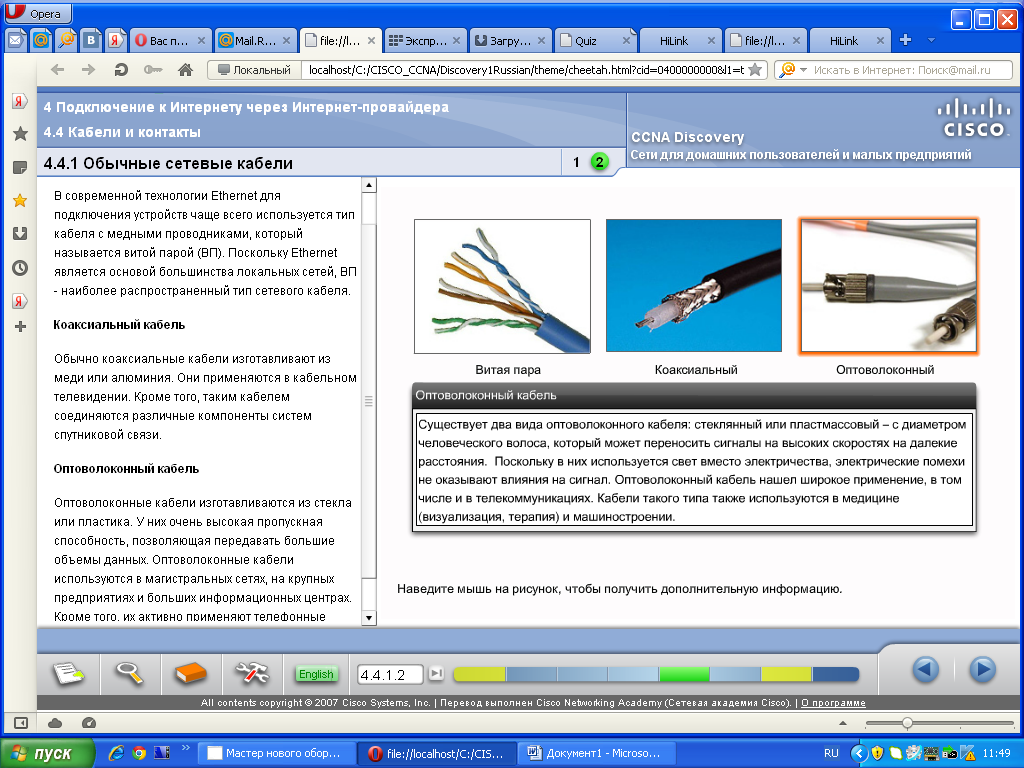 В отличие от ВП и коаксиального кабеля, оптоволоконный передает данные в виде импульсов света. Оптоволоконные кабели обычно не используются в домах и небольших компаниях, но широко распространены в крупных организациях и информационных центрах.