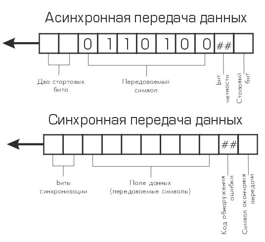 Рис. 2. Асинхронная и синхронная передача данных При асинхронной передаче каждый символ передается отдельной посылкой (рис. 2). Стартовые биты предупреждают приемник о начале передачи. Затем передается символ. Для определения достоверности передачи используется бит четности (бит четности = 1, если количество единиц в символе нечетно, и 0 в противном случае. Последний бит «стопбит» сигнализирует об окончании передачи. Преимущества: несложная отработанная система; недорогое (по сравнению с синхронным) интерфейсное оборудование. Недостатки асинхронной передачи: третья часть пропускной способности теряется на передачу служебных битов (старт/стоповых и бита четности); невысокая скорость передачи по сравнению с синхронной; при множественной ошибке с помощью бита четности невозможно определить достоверность полученной информации. Асинхронная передача используется в системах, где обмен данными происходит время от времени и не требуется высокая скорость передачи данных. Некоторые системы используют бит четности как символьный бит, а контроль информации выполняется на уровне протоколов обмена данными. При использовании синхронного метода данные передаются блоками. Для синхронизации работы приемника и передатчика в начале блока передаются биты синхронизации. Затем передаются данные, код обнаружения ошибки и символ окончания передачи. При синхронной передаче данные могут передаваться и как символы, и как поток битов. В качестве кода обнаружения ошибки обычно используется циклический избыточный код обнаружения ошибок (CRC). Он вычисляется по содержимому поля данных и позволяет однозначно определить достоверность приятой информации. Преимущества синхронного метода передачи информации: высокая эффективность передачи данных; высокие скорости передачи данных; надежный встроенный механизм обнаружения ошибок. Недостатки: интерфейсное оборудование более сложное и соответственно более дорогое.