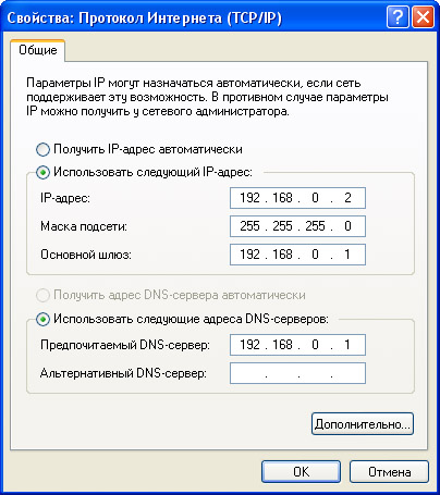Рис. 1.. Определение свойств компонента Протокол Интернета (TCP/IP) для сервера ЛВС В окне Подключение по локальной сети - свойства укажите в списке компонент Протокол Интернета TCP/IP и щелкните на кнопке «Свойства». После этого откроется окно Свойства: Протокол Интернета (TCP/IP). Включите вариант Использовать следующий IP-адрес и задайте необходимые сетевые параметры, например, как показано на рис. 1. Задание 2. Определите параметры сетевого подключения одной из рабочих станций ЛВС, задав IP-адрес компьютера 92.168.0.2, для чего откройте окно Сетевые подключения. В окне Сетевые подключения выберите сетевое подключение и, щелкнув правой кнопкой мыши, выберите в контекстном меню команду Свойства. Примечание, Обратите внимание, что IP-адрес должен быть уникальным и не может повторяться внутри одной подсети. Маска подсети устанавливается автоматически. В окне Подключение по локальной сети - свойства укажите в списке компонент Протокол Интернета TCP/IP и щелкните на кнопке «Свойства» в окне Свойства: Протокол Интернета (TCP/ IP). Включите вариант Использовать следующий IP-адрес и задайте необходимые сетевые параметры, например, как показано на рис. 2.