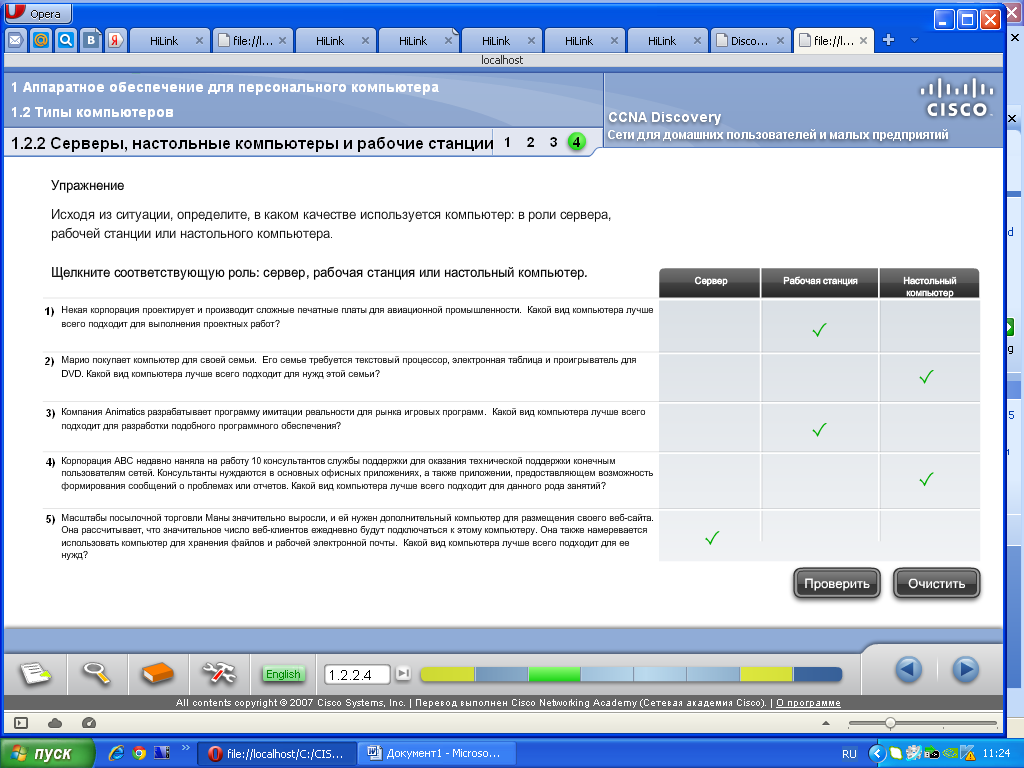 Упражнение 1 Исходя из ситуации, определите, в каком качестве используется компьютер: в роли сервера, рабочей станции или настольного компьютера. Выберите в таблице соответствующую роль.