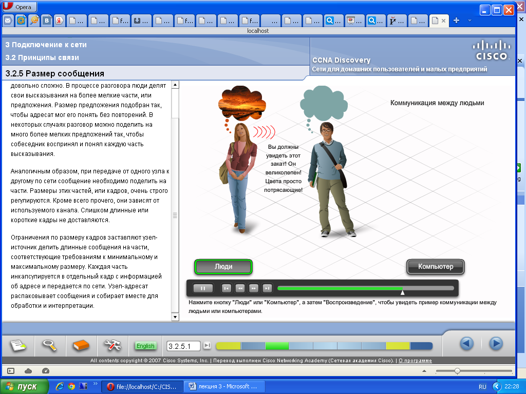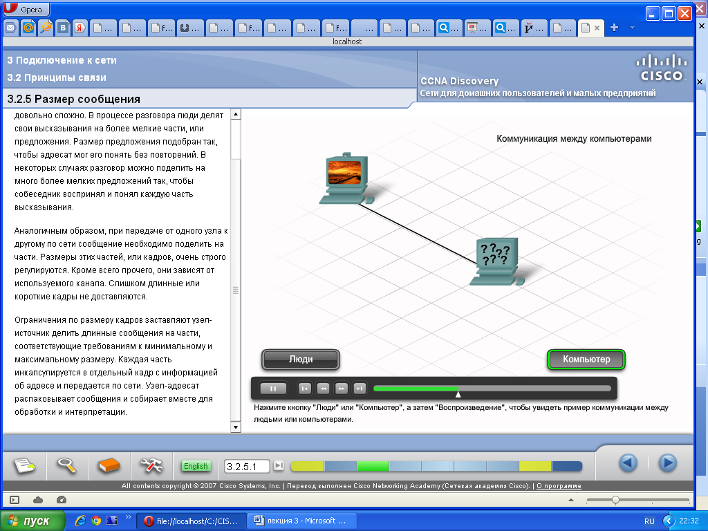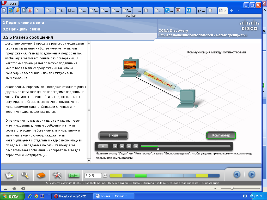 Представьте себе, каково было бы читать этот курс, если бы он выглядел как одно длинное предложение. В таком случае прочесть и понять его было бы довольно сложно. В процессе разговора люди делят свои высказывания на более мелкие части, или предложения. Размер предложения подобран так, чтобы адресат мог его понять без повторений. В некоторых случаях разговор можно поделить на много более мелких предложений так, чтобы собеседник воспринял и понял каждую часть высказывания. Аналогичным образом, при передаче от одного узла к другому по сети сообщение необходимо поделить на части. Размеры этих частей, или кадров, очень строго регулируются. Кроме всего прочего, они зависят от используемого канала. Слишком длинные или короткие кадры не доставляются. Ограничения по размеру кадров заставляют узел-источник делить длинные сообщения на части, соответствующие требованиям к минимальному и максимальному размеру. Каждая часть инкапсулируется в отдельный кадр с информацией об адресе и передается по сети. Узел-адресат распаковывает сообщения и собирает вместе для обработки и интерпретации.