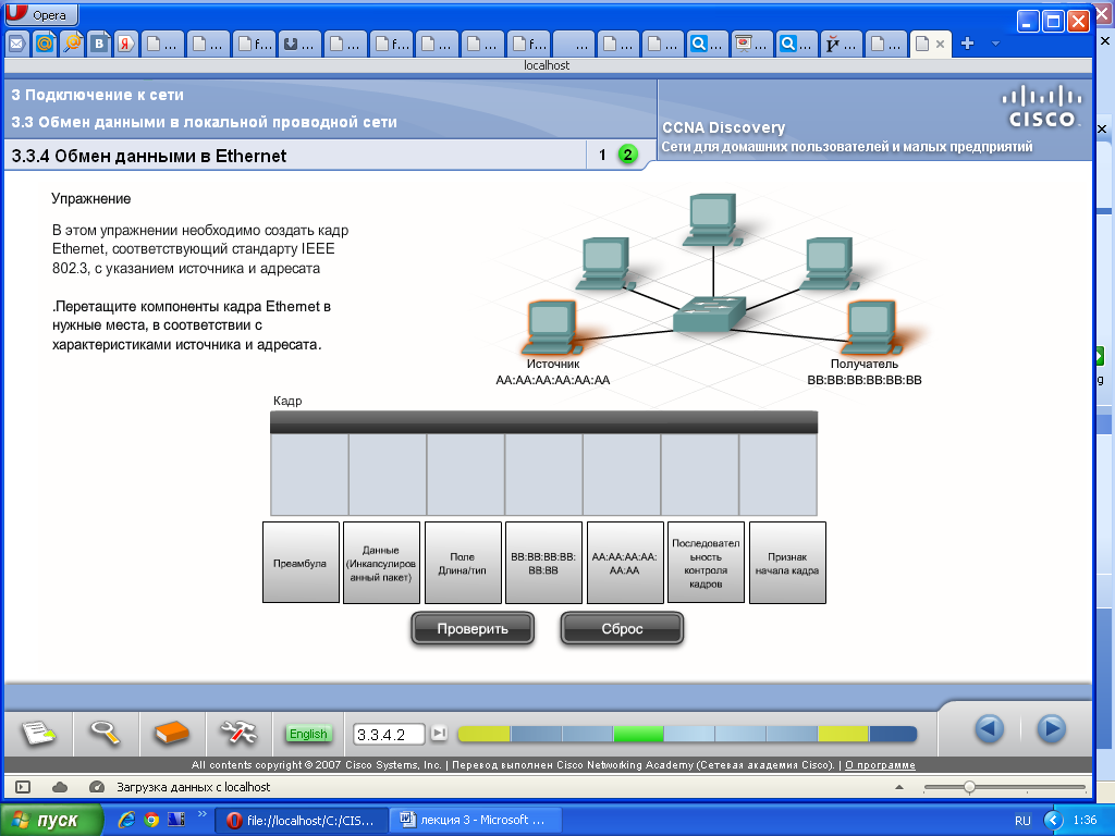 Преамбула – определенная последовательность битов (0-1) с информацией, идентифицирующей начало кадра. Признак начала кадра (start of frame delimiter – sfd) - образует отдельное поле пакета с информацией о начале кадра. МАС-адрес получател – содержит МАС-адрес приемника (получателя). Может быть одноадресным, многоадресным (группа узлов) или широковещательным (все узлы локальной сети). Поле Длина выполняет две функции: определяет тип используемого протокола и содержит информацию о длине поля данных. Инкапсулированные данные содержит пакет данных. Контрольная сумма содержит значение, создаваемое отправителем и пересчитанное получателем.