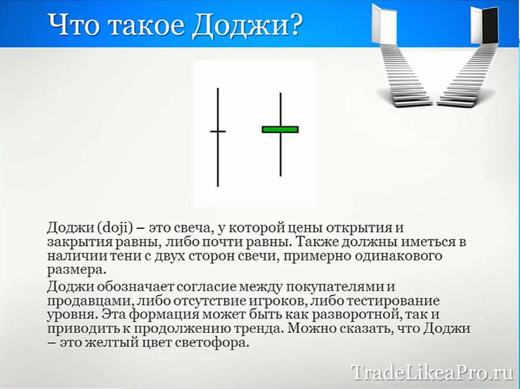 Порядок входа по паттерну Доджи: - обязательно проверяем наличие тренда перед Доджи и обязательно в этом тренде должна быть крайняя импульсная (полнотелая) свеча; - после появления доджи ожидаем закрытия подтверждающей (полнотелой) свечи против тренда; желательно наличие опорного уровня; - вход на пробой подтверждающей свечи, стоп за экстремумом Доджи.