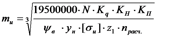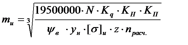 где: N – мощность передаваемая данным валом; [σ и] – допускаемое напряжение на изгиб; уН – коэффициент формы зуба; ψв – коэффициент ширины зуба; Кq – коэффициент режима нагружения; КН – коэффициент неравномерности распределения нагрузки; КП– коэффициент перегрузки; Z1 – число зубьев шестерни; nрасч – расчетная частота вращения;