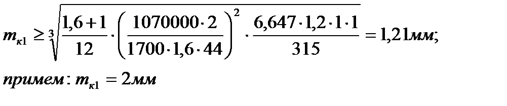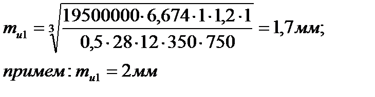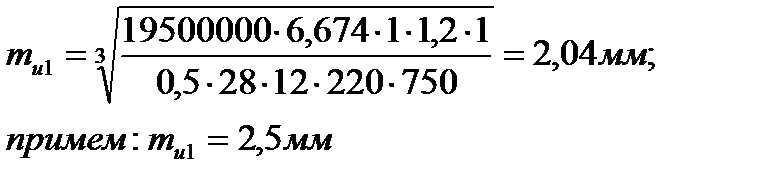 Расчет модулей в группах передач производится из условия работы зуба на изгиб и контактную прочность для коробок скоростей. Максимальное значение рассчитанного модуля mи или mк округляется до ближайшего большего стандартного значения 1; 1.5; 2; 2.5; 3; 4. В станкостроении для универсальных станков среднего типоразмера модуль менее 2 мм нежелателен. Формула для определения модуля зубьев исходя из прочности на изгиб: