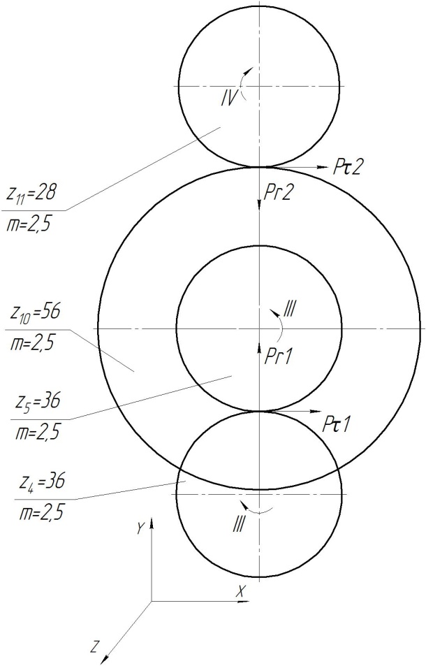 Для расчета был выбран III вал. Линейные размеры вала и расположение зубчатых колес определим из эскизного проектирования. Схема нагружения вала изображена на рис. 9. На вал III действуют окружные Рτ и радиальные Рr усилия от зубчатого зацепления.