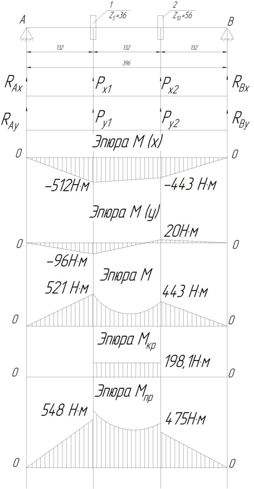∑mB(Fу) = 0, - RАy·396 –Py1 ·264 – Py2·132 = 0, RАy = - (Py1 ·264 + Py2·132)/396= -724,8 Н. Проверка: RАy + Py1 +Py2 + RBy = 0, -724,8 + 1602,3 -1030,0+152,5= 0, Реакции в плоскости zoу определены правильно. Расчет изгибающего момента в плоскости zox: Ми(х1) = RAx · a = - 511,9 H·м, Ми(х2) = RBx · c = - 442,7 H·м,