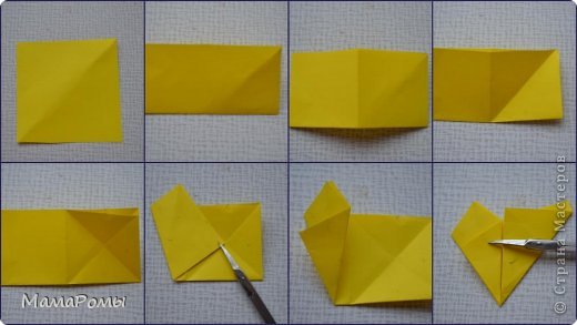 5. Затем подворачиваем правый угол под низ к другому (2-ое фото) уголок сверху снова отворачиваем на право (уголок прижат ножницами 3-е фото) Опять его отгибаем по линии сгиба (5-ое фото) я нарисовала карандашом стрелочки, все отрезаем! Расправляем получившуюся фигуру и делаем некоторые лучики звезды выпуклыми. Все!