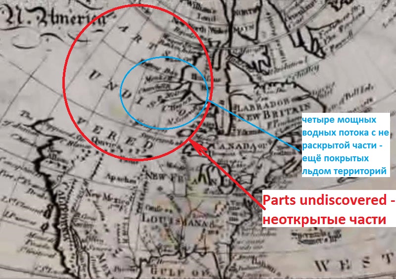 На карте из Британики 1771 на территории Северной Америки видим четыре мощных водных потока, впадающих в Гудзонов залив. Если сравнить то, как отображены на карте такие реки, как Амазонка в Южной Америке или Волга в России ну, или даже Миссисипи, которая проходит на той же карте по Луизиане, то видно, что потоки, впадающие в Гудзонов залив обозначены намного более жирными линиями, которые обозначают, что они были очень широкими и полноводными, что отлично вписывается в версию полюса в Северной Америке. На территории Северной Америки в 16-м веке активно таяла огромная ледяная шапка, оставшаяся со времён старого полюса и талые воды бурными потоками неслись в Гудзонов Залив. Потом шапка растаяла и потоки иссякли, сейчас на тех местах на карте Канады не видно никаких рек, которые были бы сравнимы с Амазонкой, всё намного скромнее, как и должно быть, если больше нет огромной массы льда, которая, тая, подпитывает эти потоки.