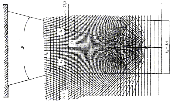 7.5 Проверочный расчет КЕО в точках характерного разреза помещения при боковом освещении следует выполнять в соответствии с методикой, изложенной в приложении Б настоящего Свода правил по формуле (Б.1). Расчет КЕО следует производить в следующей последовательности: а) график I (рисунок 8) накладывают на поперечный разрез помещения таким образом, чтобы его полюс (центр) 0 совместился с расчетной точкой А (рисунок 9), а нижняя линия графика - со следом рабочей поверхности; б) по графику I подсчитывают число лучей, проходящих через поперечный разрез светового проема от неба n 1, и от противостоящего здания п ¢ 1 в расчетную точку А; в) отмечают номера полуокружностей на графике I, совпадающих с серединой С 1 участка светопроема, через который из расчетной точки видно небо, и с серединой С 2 участка светопроема, через который из расчетной точки видно противостоящее здание (рисунок 9); г) график II (рисунок 10) накладывают на план помещения таким образом, чтобы его вертикальная ось и горизонталь, номер которой соответствует номеру концентрической полуокружности (пункт «в»), проходили через точку С 1 (рисунок 9); д) подсчитывают число лучей n 2 по графику II, проходящих от неба через световой проем на плане помещения в расчетную точку А; е) определяют значение геометрического КЕО e б, учитывающего прямой свет от неба, по формуле (Б.9) приложения Б; ж) график II накладывают на план помещения таким образом, чтобы его вертикальная ось и горизонталь, номер которой соответствует номеру концентрической полуокружности (пункт «в»), проходили через точку С 2; з) подсчитывают число лучей п ¢ 2 по графику II, проходящих от противостоящего здания через световой проем на плане помещения в расчетную точку А; и) по формуле (Б.10) приложения Б определяют значение геометрического коэффициента естественной освещенности e зд, учитывающего свет, отраженный от противостоящего здания; к) определяют значение угла q, под которым видна середина участка неба из расчетной точки на поперечном разрезе помещения (рисунок 9); л) по значению угла q и заданным параметрам помещения и окружающей застройки в соответствии с приложением Б определяют значения коэффициентов qi, b ф, k зд, r 0, t 0 и К з подставляют в формулу (Б.1) и вычисляют значение КЕО в расчетной точке помещения. Примечания 1 Графики I и II применимы только для световых проемов прямоугольной формы. 2 План и разрез помещения выполняют (вычерчивают) в одинаковом масштабе. 7.6 При наличии в помещении различно ориентированных световых проемов расчет КЕО в точках характерного разреза производят для каждого светового проема отдельно, а полученные значения КЕО для каждой точки суммируют. 7.7 При наличии в помещении балкона или лоджии проверочный расчет выполняют так же, как и для помещений без балкона или лоджии, а наличие балкона или лоджии учитывают понижающим коэффициентом t 4 из таблицы Б.8, который входит составной частью в общий коэффициент светопропускания t 0.