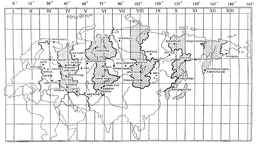 Рисунок 25 - Карта часовых поясов Расчет средней естественной освещенности в помещении от безоблачного неба при верхнем освещении в зависимости от типа светового проема производят: а) при световых проемах в плоскости покрытия, имеющих заполнение из светорассеивающих материалов, по формуле Е ср = 0,01 t 0 r 2 k ф e ср E г сум; (19) б) при световых проемах в плоскости покрытия, имеющих заполнение из светопрозрачных материалов, по формуле Е ср = 0,01 t 0 r 2 k ф b В e ср E г сум; (20) в) при фонарях шед по формуле Е ср = 0,01 t 0 r 2 k ф b В e ср E г я; (21) г) при прямоугольных фонарях по формуле Е ср = 0,01 t 0 r 2 k ф b В e ср (E в я ¢ + E в я ²), (22) где t 0 - см. формулу (Б.1); r 2 и k ф - см. формулу (Б.2); e ср - см. формулу (Б.7); E г сум - суммарная наружная освещенность на горизонтальной поверхности, создаваемая безоблачным небом и прямым светом солнца; принимают по таблице В.3 приложения В; Е г я - наружная освещенность на горизонтальной поверхности, создаваемая безоблачным небом; принимают по таблице В.3 приложения В; b в - коэффициент относительной яркости участков безоблачного неба, видимых через светопроемы; принимают по таблице 12; E в я - см. формулу (16); E в я ¢ и E в я ² - наружная освещенность на двух противоположных сторонах вертикальной поверхности; принимают по таблице В.4 приложения В. Примечания 1 Прямой солнечный свет в расчетах освещенности учитывают при наличии в световых проемах солнцезащитных средств или светорассеивающих материалов; в остальных случаях прямой солнечный свет не учитывают. 2 Значения расчетных коэффициентов в таблицах 11 и 12 приведены для местного среднего солнечного времени. Таблица 11