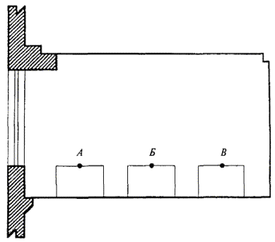 А, Б, В - Расчетные точки Рисунок 27 - Схематический поперечный разрез школьного класса Примечание - Учитывая, что в таблице В.1 приложения В для 50° с. ш. наружная освещенность не приведена, находят требуемое значение наружной освещенности методом линейной интерполяции. Таблица 14
