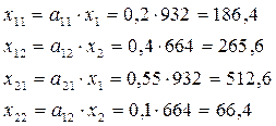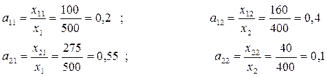 1. Вычисляем коэффициенты прямых затрат aij, показывающие, какой объем продукции i -й отрасли идет на производство одной единицы продукции j -й отрасли: