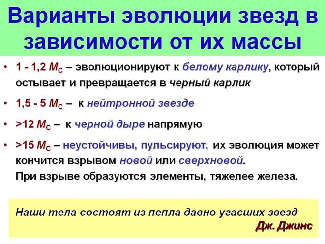 Звёзды типа T Тельца Звёзды, которые ещё не вступили на главную последовательность. Они весьма молоды и имеют массу меньше двух солнечных. Температура их поверхности такая же, как и у звёзд главной последовательности той же массы, но они имеют несколько большую светимость, потому что их радиус больше. Температура в их ядре недостаточна, чтобы запустить термоядерную реакцию, которая начнётся приблизительно через 100 млн лет после образования звезды. Основным источником их энергии является гравитационное сжатие. Новые звёзды Все новые звёзды являются тесными двойными системами, состоящими из белого карлика и звезды-компаньона, находящейся на главной последовательности, либо достигшей в ходе эволюции стадии красного гиганта. Сверхновые звёзды Данный объект является итогом катаклизмического процесса, сопровождающегося выделением значительной энергии и возникающий в конце эволюции некоторых звёзд. Взрыв сопровождается выбросом значительной массы в межзвёздное пространство. А на месте звезды-прародителя, как правило, остаётся компактный объект, нейтронная звезда или чёрная дыра. Вместе, они образуют остаток сверхновой. Как правило, сверхновые звезды наблюдаются постфактум, то есть когда событие уже произошло. Поэтому их природа довольно долго была неясна. Гиперновая Возникает в результате взрыва массивной звезды (с массой более 20 масс Солнца) после коллапса её ядра. Коллапс ядра происходит после того, как в нём истощается топливо для поддержания термоядерных реакций; другими словами, это очень большая сверхновая. LBV (Luminous blue variable) – яркая голубая переменная очень яркие голубые пульсирующие гипергиганты. Они показывают неправильные (иногда циклические) изменения блеска. Обычно, это самые яркие голубые звезды галактик, в которых они наблюдаются. Как правило, связаны с диффузными туманностями и окружены расширяющимися оболочками. Встречаются исключительно редко. Яркие голубые переменные могут сиять в миллион раз сильнее, чем Солнце и их масса может составлять 150 солнечных, подходя к теоретическому пределу массы звезды, что делает их самыми яркими, горячими и мощными звёздами во Вселенной. Звёзды этого типа всегда находятся в состоянии неустойчивого гидростатического равновесия, поскольку с их поверхности постоянно истекает мощнейший звёздный ветер, который всё время снижает их массу. По этой причине они всегда окружены туманностями. Из-за их огромной массы время жизни таких звёзд очень мало: всего несколько миллионов лет. Нейтронные звёзды Астрономический объект, являющийся одним из конечных продуктов эволюции звёзд, состоящий, в основном, из нейтронной сердцевины, покрытой сравнительно тонкой корой вещества в виде тяжёлых атомных ядер и электронов. Массы нейтронных звёзд сравнимы с массой Солнца, но типичный радиус составляет лишь 10—20 километров. Поэтому средняя плотность вещества такой звезды в несколько раз превышает плотность атомного ядра. Дальнейшему гравитационному сжатию нейтронной звезды препятствует давление ядерной материи, возникающее за счёт взаимодействия нейтронов. Считается, что нейтронные звёзды рождаются во время вспышек сверхновых звёзд. Уникальные звезды (SS 433) Двойная затменная звёздная система, включающая в себя два компонента. Один из них представляет собой массивную звезду высокой 