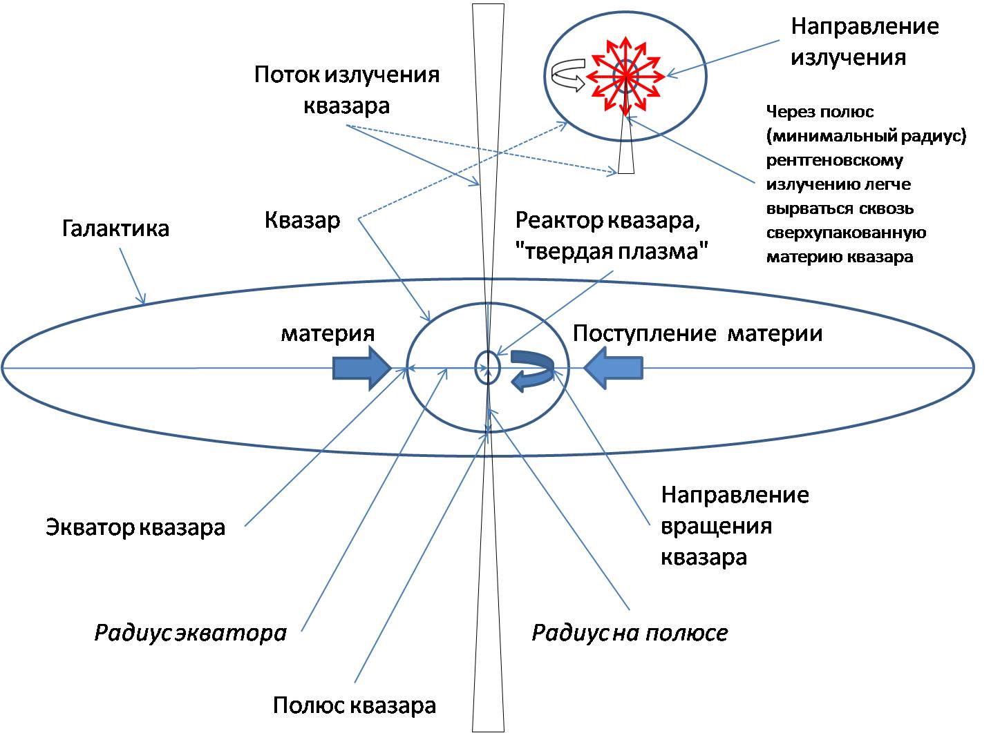Нейтроны в свободном состоянии или в ядре, состоящем только из них, находиться не могут. Это короткоживущая частица. Поэтому нейтронных звезд с такой формулировкой существовать не может. Это объект с определённой массой обычных тяжелых металлов –сверхупакованных. Пульсар и квазар имеют одну и ту же природу – это объекты, достигшие такой массы, что в их центре давление такое (давление на дне океана существенно!), что электрон опускается на ядро атома и происходит "аннигиляция" электрона и протона. Это происходит с выделением потенциальной энергии заряженных частиц (электрон, протон), протон в этой ядерной реакции превращается через определенные стадии взаимодействия кварков в нейтрон, который в свободном состоянии быть не может. И уже из нейтрона рождаются другие частицы, которые не могут иметь никакой заряд, т. к. давление в центре квазара или пульсара не даёт вновь образоваться никаким заряженным частицам. В результате получается такая ситуация, что в центре такого объекта любая масса превращается в энергию фотонов. Никакой черной дыры (в истинном смысле) быть не может. Тем более черная дыра никак не может испускать мощнейшие потоки излучения – это не черная дыра, это другое. Чем больше массы поглощается таким объектом, тем больше поток излучения в квазаре или пульсаре. Происходит динамическая стабилизация процесса: увеличение массы квазара ведет к увеличению потока излучения. Стабилизация процесса сравнивает скорость поступления массы и скорость излучения квазара, аналогично динамическому балансу на солнце. В центре солнечной системы или в центре галактики масса тяжелых элементов не может быть больше определенного значения – их регуляторы – пульсар и квазар. Если пульсар попадет в центр галактики, он превратится в квазар. Если столкнутся два квазара или пульсара, то останется один, другой превратится в энергию излучения. Полностью излучившие квазары или пульсары превращаются в "блуждающие" квазары (пульсары) – это один и тот же объект определенной массы, уже не излучающий. Такие объекты и являются центрами начала кристаллизации – образования новых звезд и галактик. Это своего рода пылесосы энергии – поглощают материю и испускают со скоростью света фотоны. Эти объекты непосредственные участники круговорота энергии в метагалактике.