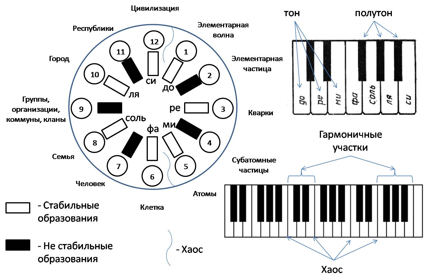 Хаос находится между 12-м и 1-м уровнями (бурление метагалактик – первичная энергия), и между 5-м и 6-м уровнями – хаотичное движение атомов (задающее термодинамику). Хаос – движитель эволюции. Разветвления берут начало до белых клавиш (тонов). К примеру, живая и неживая природа разветвляется на уровне атомов и молекул.