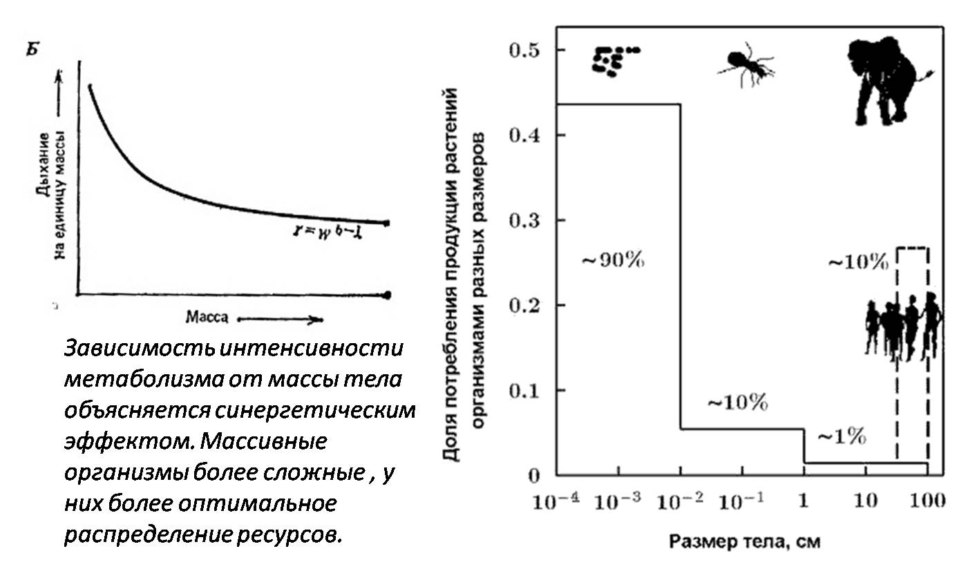 3. Эволюция жизни Каждый новый уровень неживой природы состоял из 105 элементов предыдущего "вдоль" (длины, ширины или высоты). Это связано с синергетическим эффектом уменьшения внутренней напряженности первоначального хаоса – генератора энергии. Любая реакция течет с выделением энергии (как в химических реакциях), аналогично могут образовываться вихри, ураганы, торнадо. Вихрь уменьшает потенциальную напряженность атмосферы. Каждая новая структура выжимает энергию из первоначального хаоса более оптимальным построением фрактала. Действие синергетического эффекта наглядно можно увидеть на законе энергопотребления биосистем: E=M3/4 Это значит, что количество пищи, необходимое более массивным животным, меньше на единицу массы, чем для более мелких. Энергопотребление более сложных структур – эффективней, это связано со специализацией каждой подсистемы (составляющего фрактала – симбиотических систем), более оптимального управления, поглощения. Рассмотрим уровни эволюции систем на примере человека: