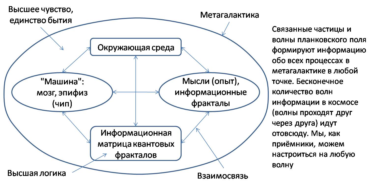 Так как в мире всё фрактально, то и на информационном уровне происходят те же процессы. Это значит, что мысли у нас в голове – это информационные фракталы (вот почему в народе ходит выражение "тараканы в голове"). Эти мысли живут сами по себе. В мозге происходит война идей. Мысли подчинены тем же правилам взаимодействия фракталов: 1. Нейтральное (Н); 2. Управление (У); 3. Симбиоз (С) (по шкале от симбиоза до паразитизма); 4. Поглощение (П). Образование мысли как фрактальной сущности имеет следующий механизм: от органов чувств, приходят сигналы, проецирующие и запускающие информационные вихри (взаимодействия маленьких алгоритмов – циклов между нейронами) – эти вихри (фракталы) и есть живые мысли. Принцип аналогии и подобия позволяет объекту живой или неживой природы проецироваться в информационную копию себя. Этот скопированный фрактал, оказывается, имеет те же свойства, что и сам объект. Именно эта особенность, позволила совершать с мыслями определенные действия. Так появилось образное мышление. Оно предполагает, что независимо от объекта мы можем, например, мысленно ударить камнем по ореху: и эти объекты (мысли), имея те же свойства, что и реальные объекты, поведут себя как реальные – орех расколется. Так появился язык образного мышления и обмен идеями. Так ведут себя все фракталы. Цикличность сфер – это и есть 4-й, 8-й и 12-й уровни. Каждый протон сам по себе; каждая семья сама по себе (человек – 7-й уровень, не свободный т. к. он нуждается в семье, хочет он этого или нет), каждая метагалактика независима. Управление осуществляется на уровнях формирования атома (протон "управляет" действием электрона), у любой группы (уровень 9) есть лидер, который ей управляет, элементарная волна управляется механизмом хаоса метагалактик (планковских частиц). Аналогично симбиотическое формирование у элементаной частицы: все элементарные волны, участвующие в её формировании, действуют сообща. Формирование клетки носит ярко выраженный симбиотический характер: все органеллы подчинены единой цели и действуют сообща. Город – это симбиотическая система групп, действующих едино, на общее благо. Аналогично описывается и формирование механизма поглощения – 3-й уровень: они поглощают элементарные частицы (вихри меньшего порядка); 7-й уровень – биосистема: "поглощает" (включает) в себя внутренние системы и клетки. Республики (галактики в неживой природе) поглощают в себя города, и данное поглощение нельзя отнести, например, к симбиозу и уж явно – к управлению. Но у поглощения прослеживается размытый центр (в галактике). В республике этот условный центр – столица, в биосистеме – одна главная система (у человека – нервная, у слабоэволюционирующих – пищеварительная).