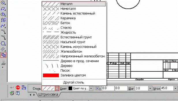 Рис. 44 Панель свойств выполнения команды Многоугольник Все индивидуальные графические задания к лабораторной работепредполагают использование способа построения многоугольника по описанной окружности. Точку центра базовой окружности можно указать курсором или ввестиее координаты с клавиатуры в окна Центр на панели свойств (рис.41), затем задается величина радиуса описанной окружности. Многоугольник – это единый объект, а не набор отдельных отрезков. Он будет выделяться, редактироваться и удаляться целиком. ШТРИХОВКА Если необходимо заштриховать одну или несколько областей втекущем виде чертежа или во фрагменте, то для вызова командыиспользуется кнопка Штриховка на инструментальной панелиГеометрия. Штриховка строится автоматически, если выполнены следующиеусловия: 1. Контур (граница) штриховки вычерчен основной линией или линией для обрыва; 2. Контур замкнут. Укажите точку внутри области, которую нужно заштриховать. Система автоматически определит ближайшие возможные границы, внутри которых указана точка. Кнопки Панели специального управления (рис.47) предоставляют дополнительные возможности создания границ штриховки. Кнопка Ручное формирование границ позволяет перейти к созданию временной ломаной линии, а кнопка Обход границы по стрелке - к формированию контура, образованного пересекающимися объектами. Для настройки параметров штриховки служат элементы Панелисвойств (рис.47). Из списка Стиль можно выбрать стиль штриховки (металл, камень,дерево и т.п.). Список Цвет позволяет выбрать цвет штриховки. Щелчок на строке Другие цвета выводит на экран расширенный диалог выбора цвета. В полях Шаг и Угол можно ввести или выбрать из списка шаг и угол наклона штриховки.